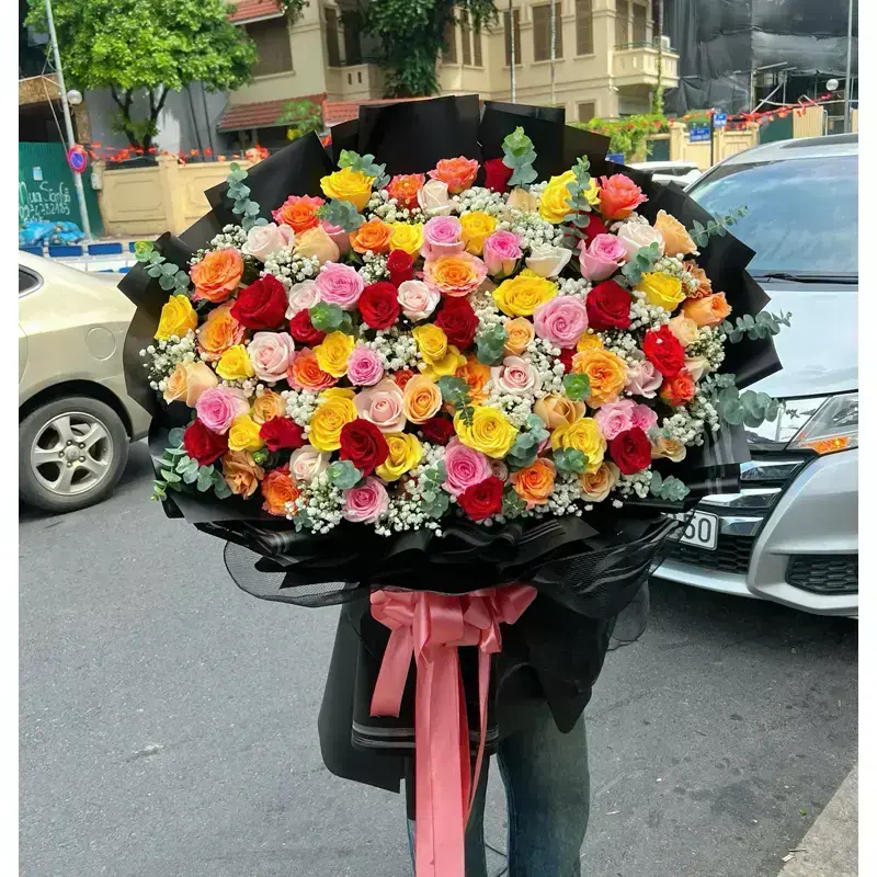 Let emotions blossom with Blooming Harmony, a luxurious bouquet of 100 radiant roses in an exquisite palette of red, yellow, pink, orange, and peach.