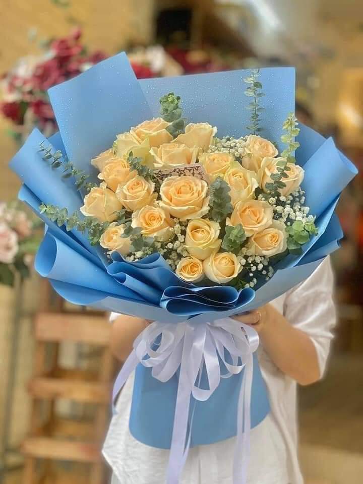 This Rose Bouquet contains 20 Stalks of Champagne Roses, Green Button and Baby Breaths wrapped with wrapping paper and ribbon.