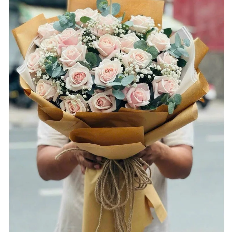 Make every moment special with this exquisite light pink rose bouquet. Featuring fresh, premium-quality pink roses carefully arranged with delicate baby’s breath and lush eucalyptus leaves, this bouquet exudes elegance and charm. Wrapped in sophisticated kraft paper with a rustic rope tie, it is perfect for romantic occasions, anniversaries, birthdays, or as a heartfelt gift to show appreciation.