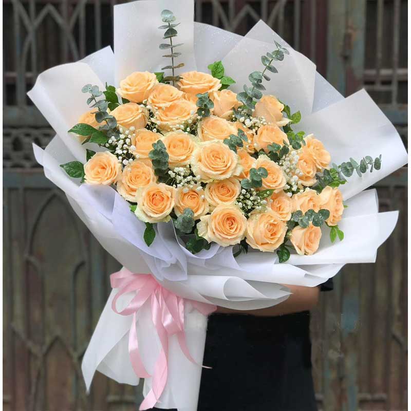 This on-trend combination of 30 Champagne roses and other cute flowers in the simple but romantic bouquet is perfect gift for your people in many special ocassions.These ones are harvested and collected in our fresh farm to keep this natural beauty.
