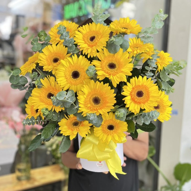 A basket adorned with yellow gerbera flowers creates a beautiful and sunny arrangement, perfect for spreading joy and warmth.