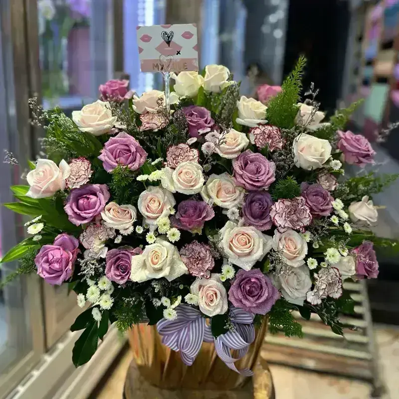 Delicate and dreamy, Lavender Whisper is a graceful symphony of soft purple, blush pink, accented with fresh greenery. Handcrafted to express elegance, admiration, and heartfelt affection, this luxurious floral arrangement is perfect for romantic gestures, heartfelt apologies, or simply to brighten someone’s day.