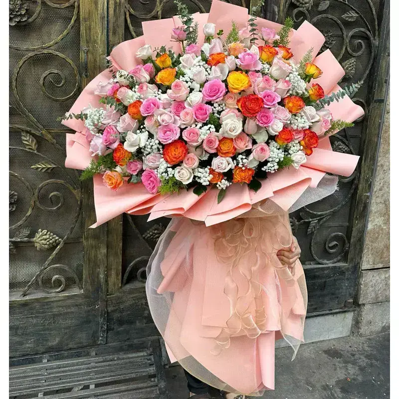 A luxurious bouquet of 130 roses in a stunning mix of colors. The arrangement showcases the vibrant beauty of each bloom, carefully arranged to create a balanced and visually striking composition. The bouquet is full and lush, with fresh green foliage adding contrast and depth, making it a perfect gift for any special occasion.