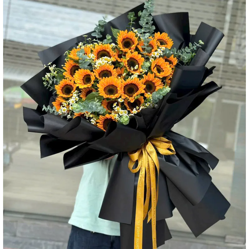 A captivating bouquet featuring a lush arrangement of vibrant sunflowers, their golden petals radiating warmth and happiness. Perfect for any occasion, this bouquet is sure to make a lasting impression.