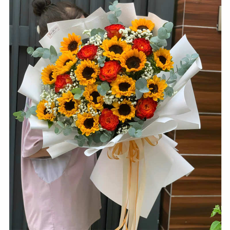 The “Walking on Sunshine” bouquet typically features a bright and cheerful mix of yellow flowers, symbolizing happiness and optimism. It often includes sunflowers and roses arranged to exude warmth and joy. These bouquets are perfect for bringing a touch of sunshine into someone’s day, whether it’s for a celebration, to cheer someone up, or just to brighten a space.