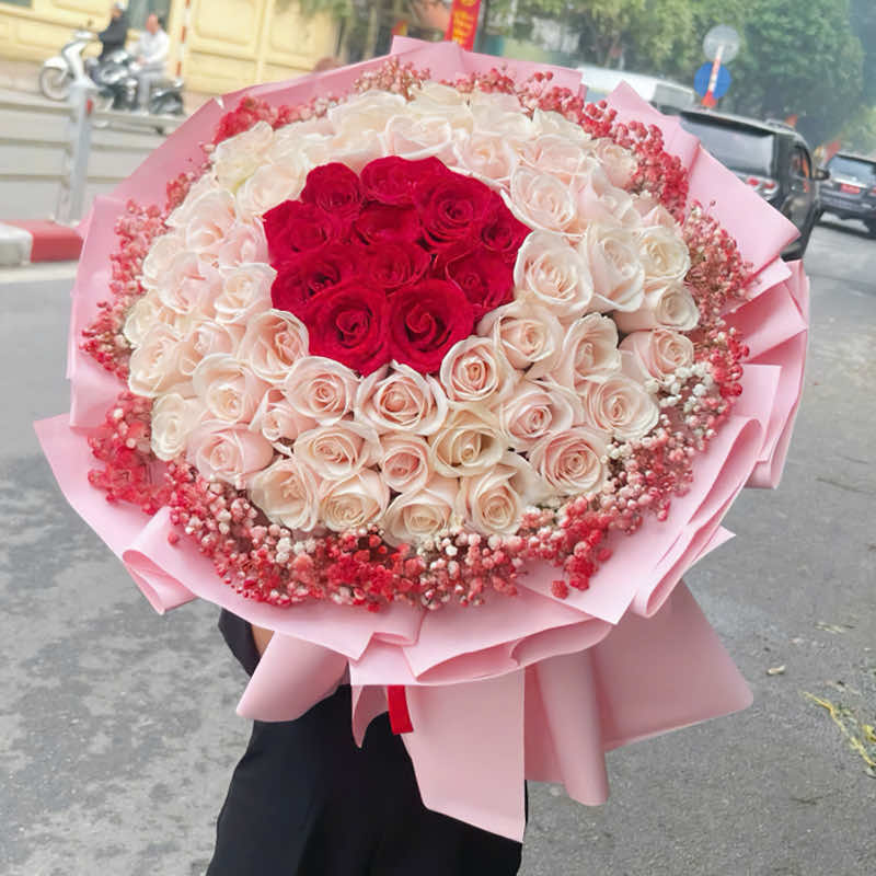The “Whispering Wonders” bouquet is an elegant and luxurious arrangement featuring 80 exquisite roses. The roses are carefully selected for their rich, velvety petals and vibrant hues, which range from deep crimson reds to soft, blushing pinks. Each rose is meticulously arranged to create a balanced and harmonious display, with the larger blooms centered and surrounded by slightly smaller buds that add texture and depth. The “Whispering Wonders” bouquet is perfect for expressing deep affection, admiration, or celebrating a significant milestone, as it conveys a message of timeless beauty and heartfelt emotions.